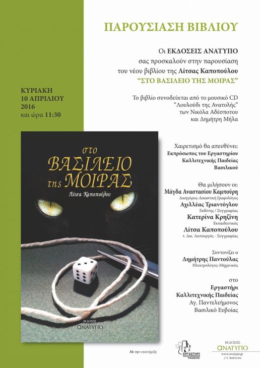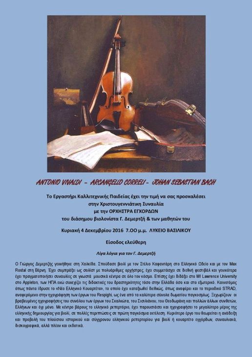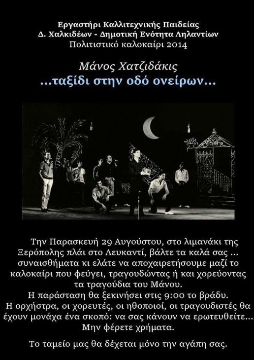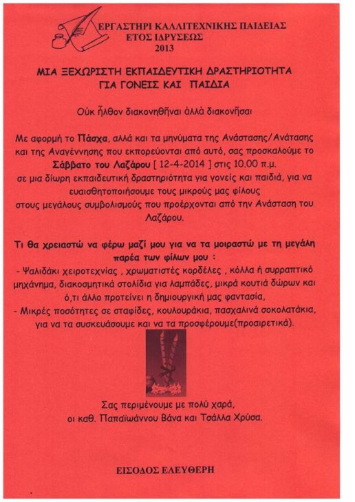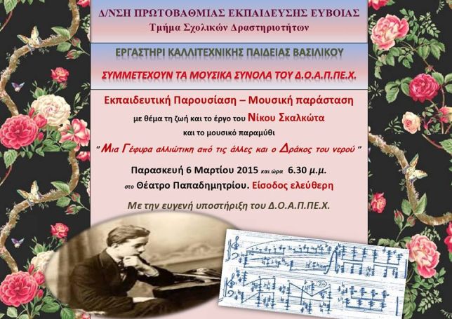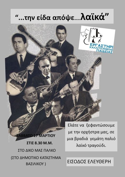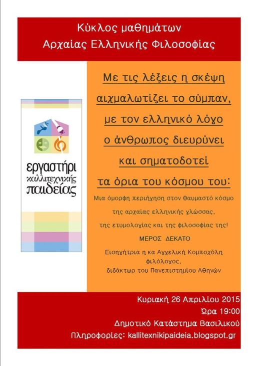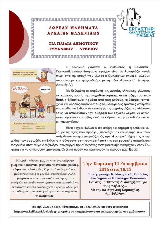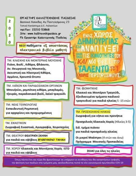 ARTS LAB aka ʽErgastiri Kallitexnikis Paideiasʼ was established in 2002 in Vasiliko, the capital town of the former Municipality of Lilantion near to Chalkida the capital of Evia Island – and is run as a municipal corporation for cultural growth. Soon it became popular to students and adults as the main cultural center of the area. Besides taking the leading role in creating culture and art to the local society, the ARTS LAB has often collaborated and inspired other cultural societies and private individual art and music schools.